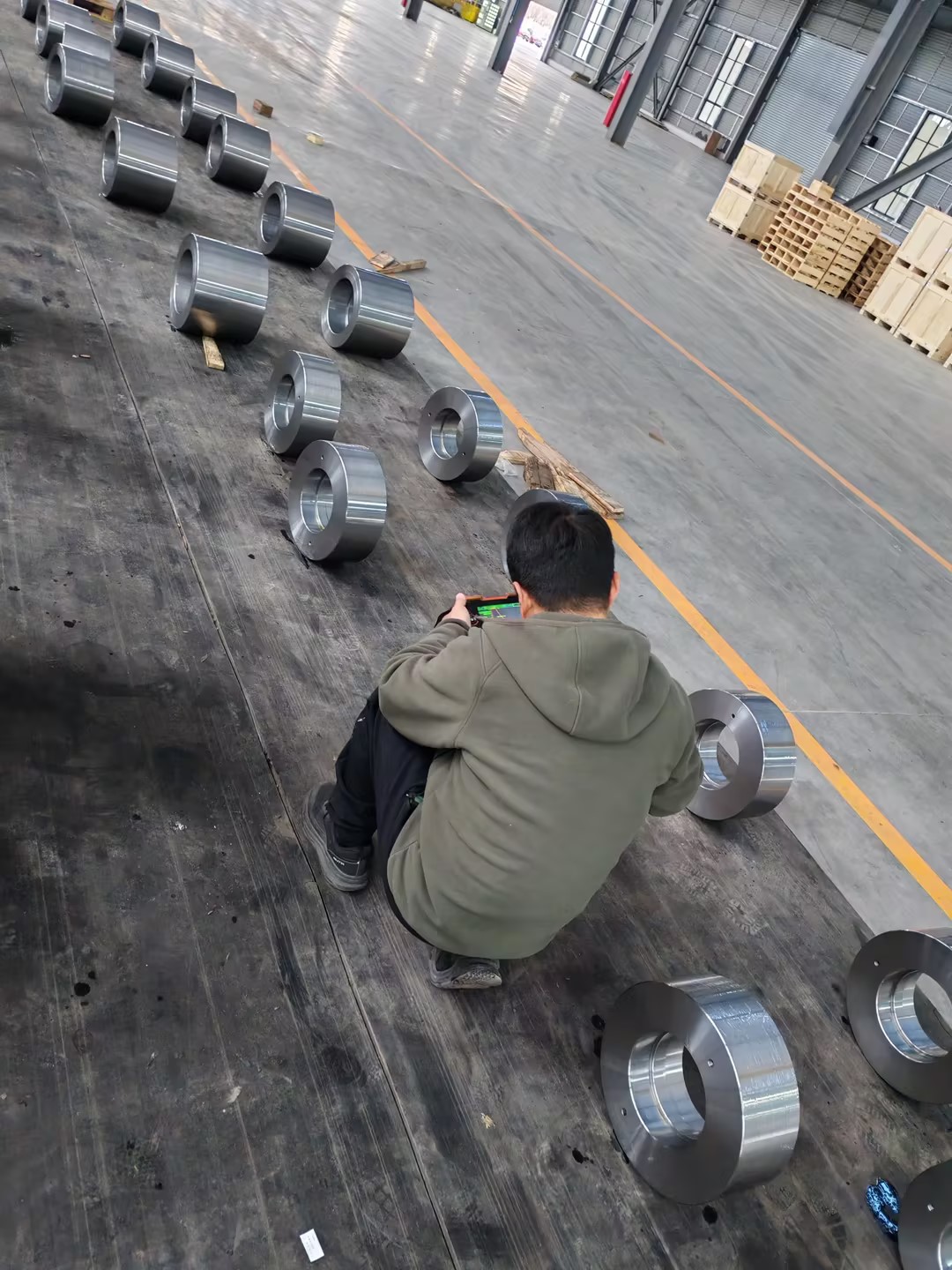 Zákaznická kontrola hotových kovaných prstencových výrobků na místě
