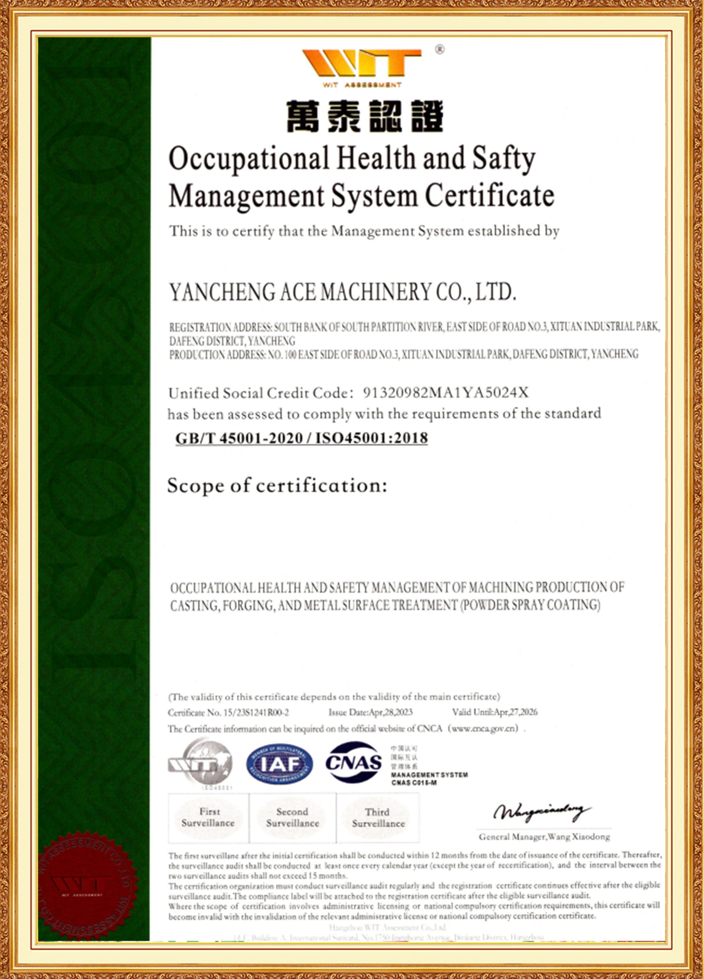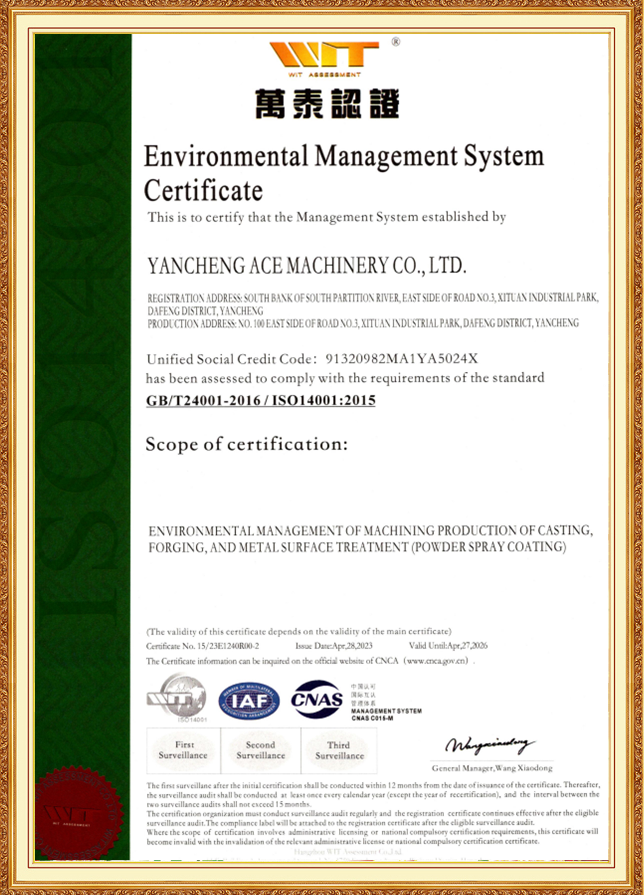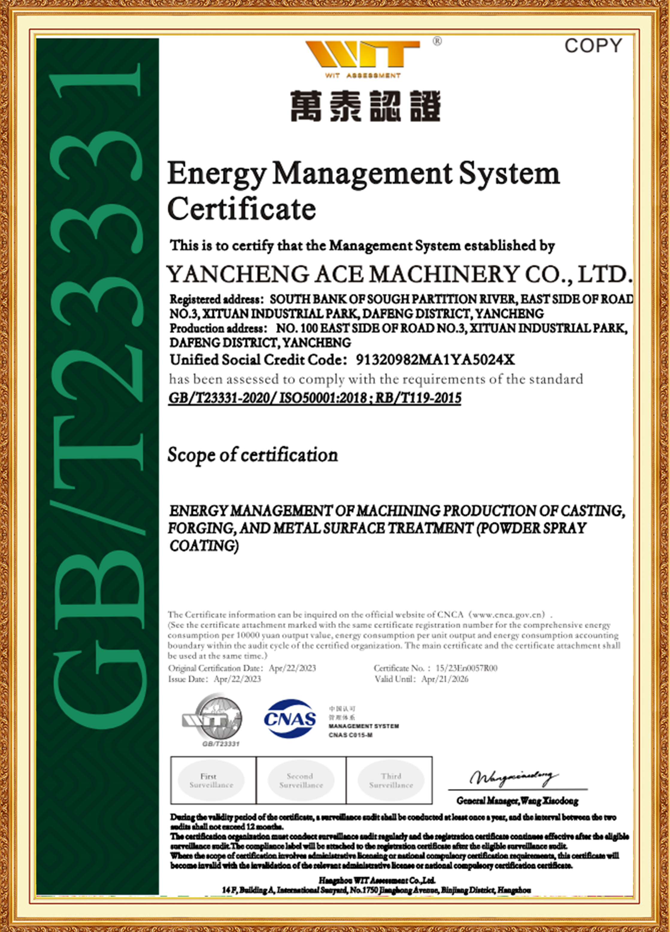 Skupina ACE je podporována manažerským týmem mladých klíčových členů, kteří mají zkušenosti v oblasti materiálů, tepelného zpracování, obrábění a povrchových úprav. Dobře se orientují v mezinárodních a domácích standardech, jsou průkopníci a odhodláni inovovat. Dceřiná společnost ACE Machinery prošla certifikací systému managementu kvality ISO 9001 TÜV Rheinland a také systémovými certifikacemi ISO 14001, 45001 a 50001. Je uznávána jako specializovaný, rafinovaný, jedinečný a inovativní podnik, národní podnik v oblasti špičkových technologií a má podnikový úvěrový rating na úrovni 3A.