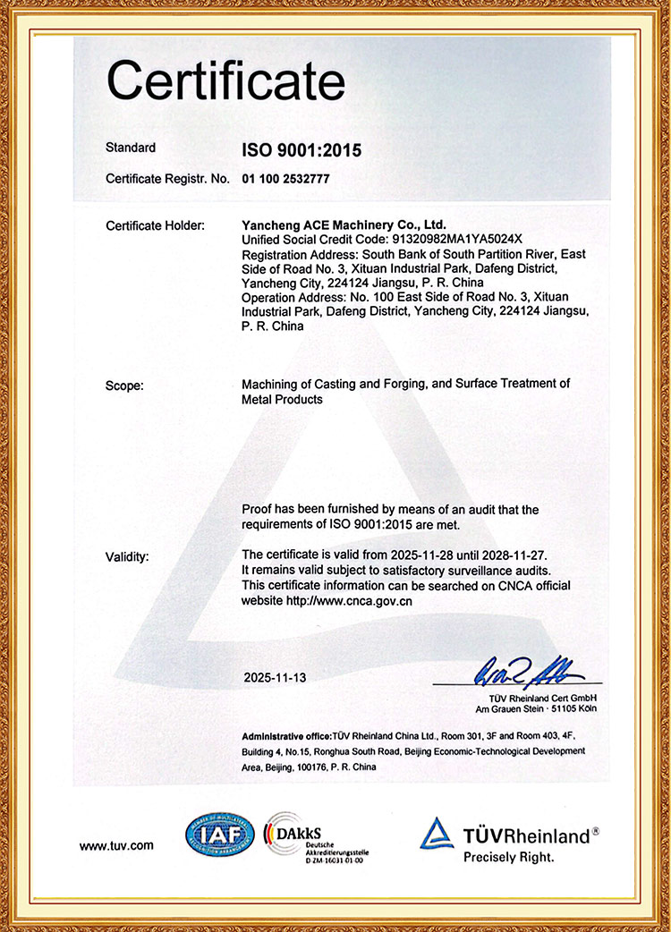 Jiangsu ACE Energy Technology Co., Ltd.: Hlavní výrobní základna skupiny, oficiálně zahajující provoz v listopadu 2025. Zaujímá 55 akrů s celkovou podlahovou plochou přesahující 50 018 metrů čtverečních. Továrna je vybavena elektrohydraulickými kladivy o nosnosti 3, 5 a 15 tun; Vertikální válcovací stroje o délce 1 metr a 1,5 metru; energeticky účinné topné pece na zemní plyn; odporové pece tepelného zpracování; kalicí nádrže; zařízení pro indukční kalení; obráběcí centra; a další výrobní zařízení.